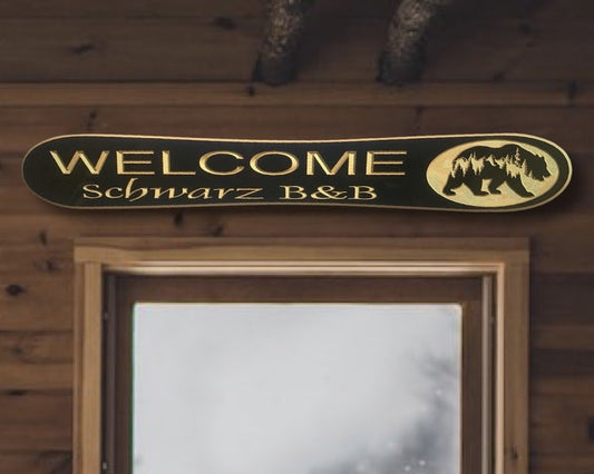 Welcome personalized snowboard / fat ski shaped sign with spirit bear