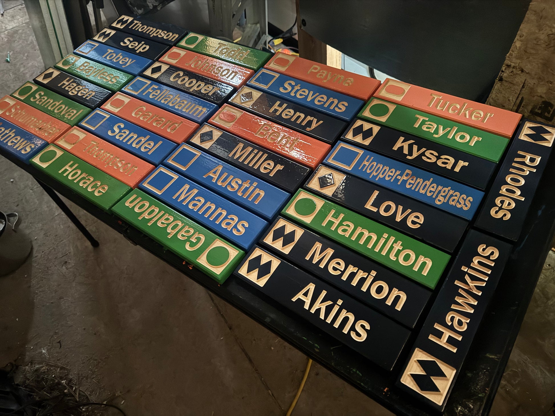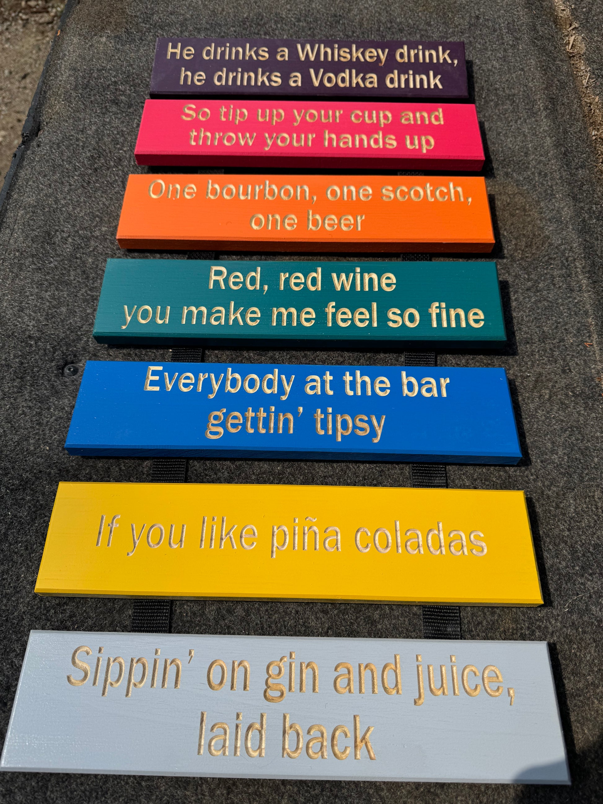 For indoors use our signs are intended to be mounted on the wall or a door or some other vertical flat surface. The standard sized signs are light enough that command strips or similar will work and do not leave a mark. Alternatively as of Sep 2025 we will preinstall 3D printed hangers with all our signs if that option is selected when ordering. These are the type that slip over 2 screws on the surface so that the sign does not protrude more than about 1/8" from the wall.