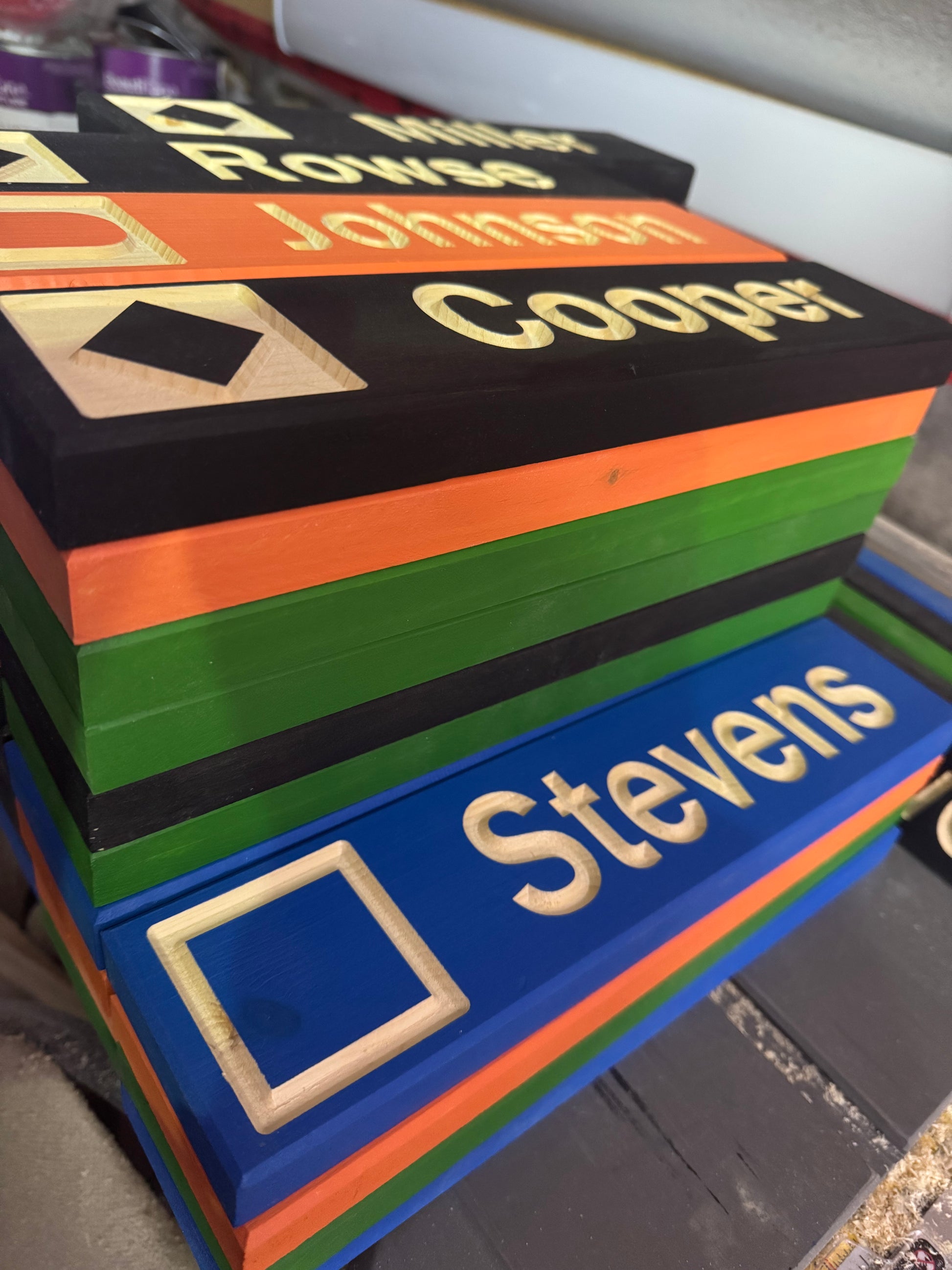 - Front and sides are painted in your chosen color; carved sections and back are natural wood tone. Want a contrasting color for the carvings? Check out our larger signs for that option.