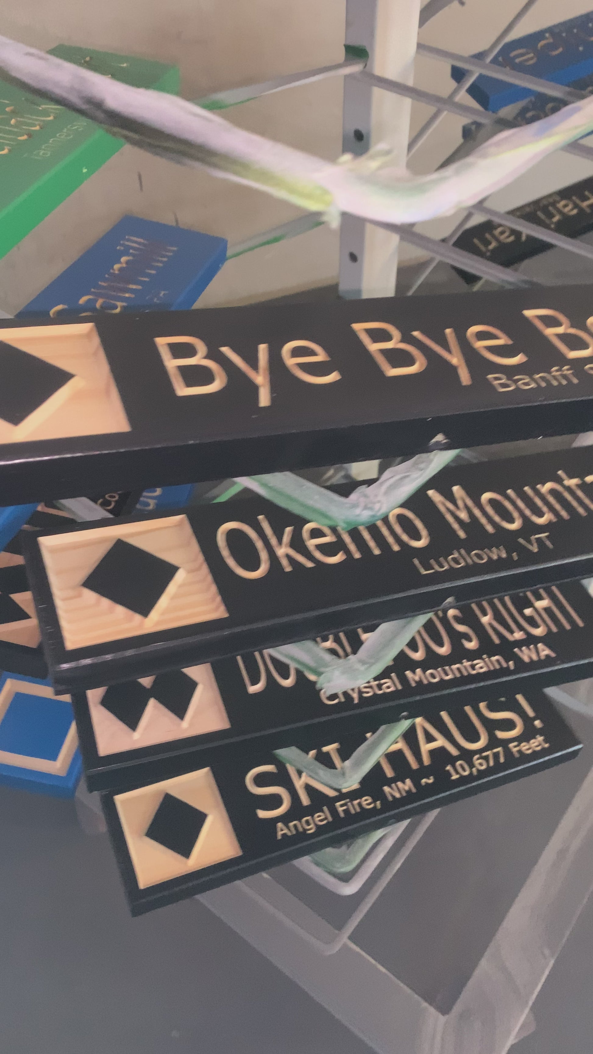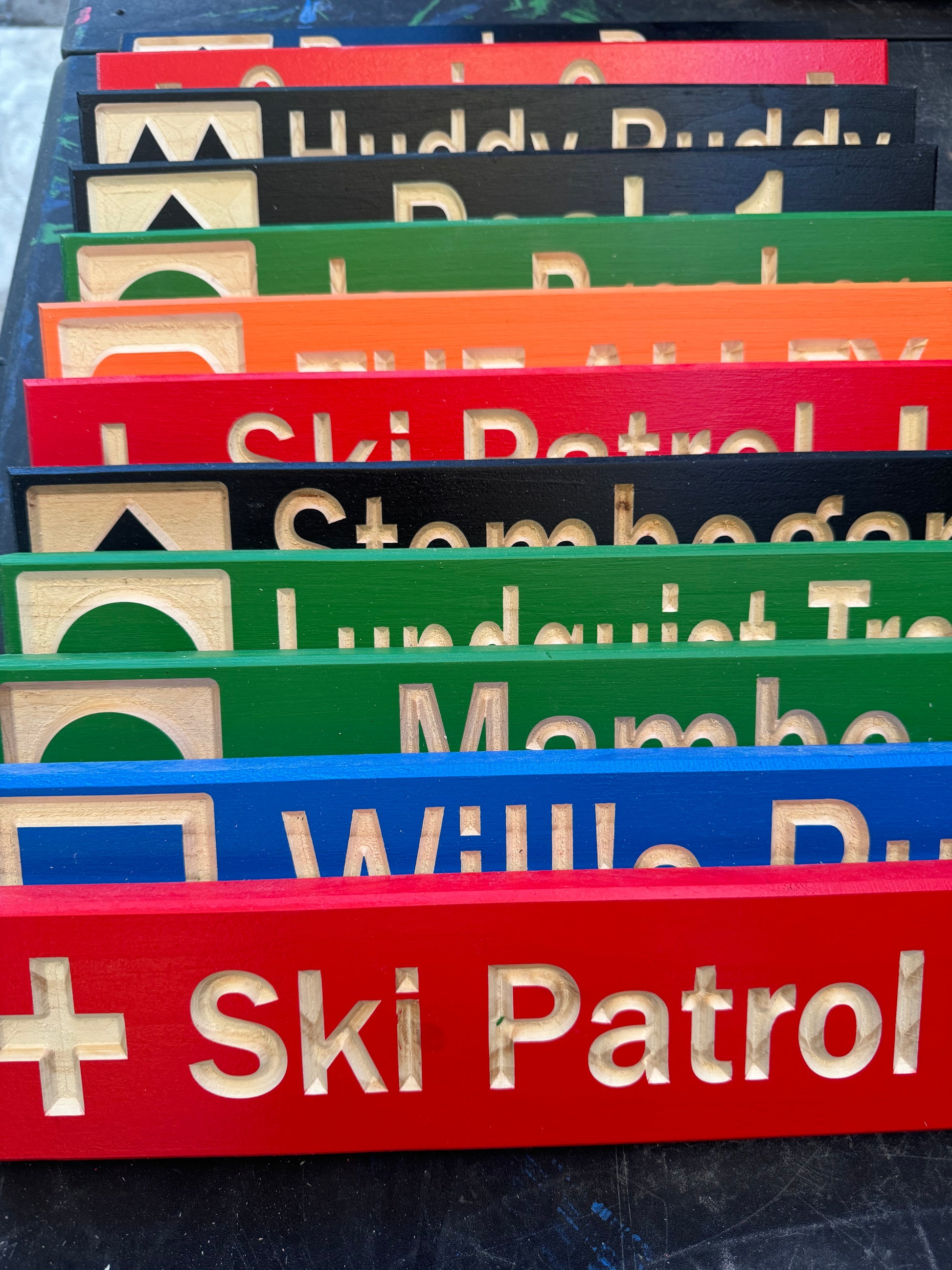 Looking for a fun, unique way to show off your passion for skiing? Our mini 3" x 13" wood carved ski trail signs are just what you need! These signs are the original design, often copied but never matched — check out our 5-star reviews to see why happy customers keep coming back.