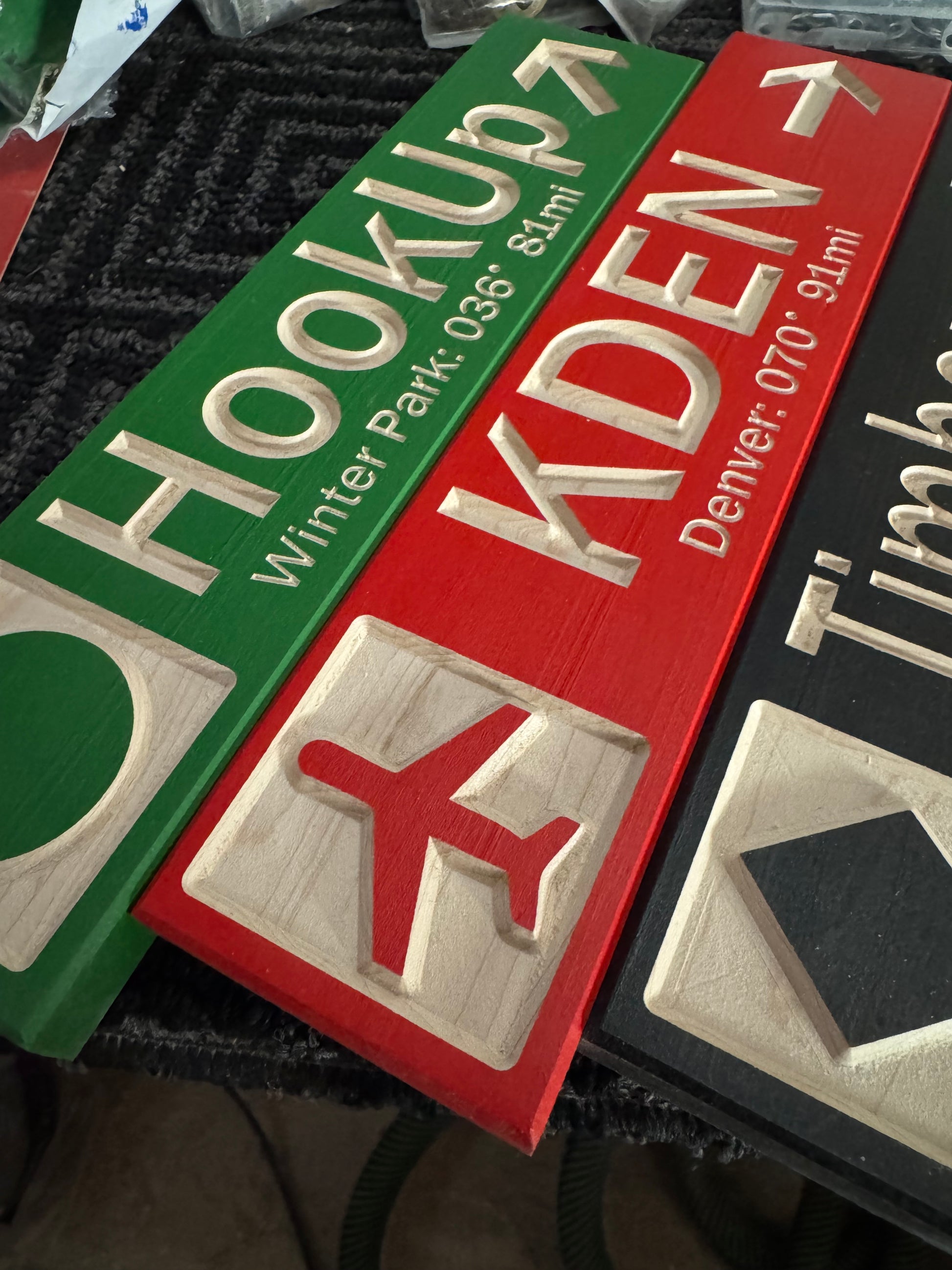 For indoors use our signs are intended to be mounted on the wall or a door or some other vertical flat surface. The standard sized signs are light enough that command strips or similar will work and do not leave a mark. Alternatively as of Sep 2025 we will preinstall 3D printed hangers with all our signs if that option is selected when ordering. These are the type that slip over 2 screws on the surface so that the sign does not protrude more than about 1/8" from the wall.